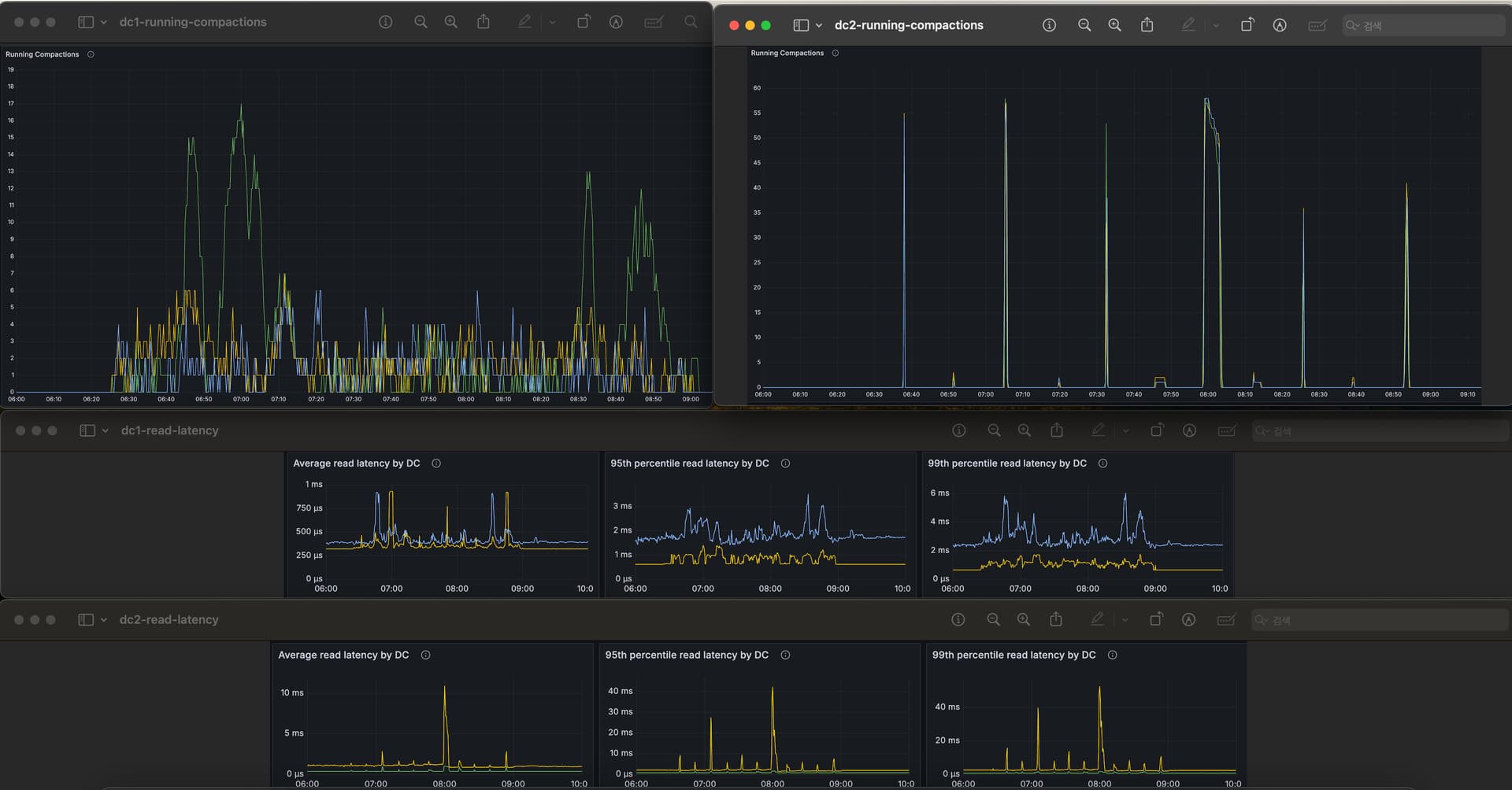 And due to heavy compaction on DC2, durning batch operations, read p95, p99 latency spikes occur.